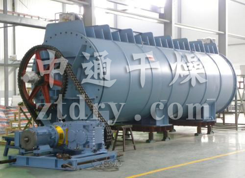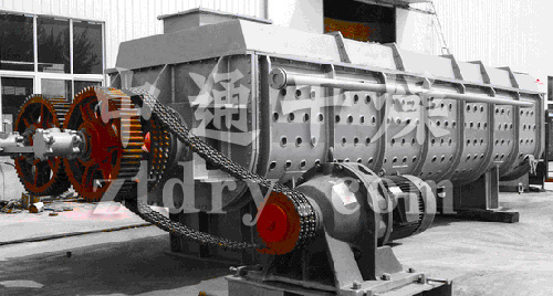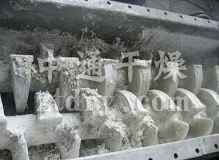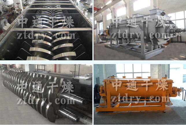 空心轴上密集排列着楔型中空浆叶,热介质经空心轴流经浆叶。单位有效容积内传热面积很大,热介质温度从40℃到320℃,可以是水蒸汽,也可以是热水或导热油等。传热介质通过旋转接头,流经壳体夹套及空心搅拌轴,空心搅拌轴依据热介质的类型而具有不同的内部结构,以保证最佳的传热效果。 在浆叶及夹套通入蒸汽加热的同时,出料口上部同时通入经过加热后的干空气进一步干燥,这样大大增加了设备的干燥强度。蒸发出来的水分由尾气带出干燥机,经过布袋除尘器过滤,将干燥后的细粉回收下来,湿空气由水除尘后引风机排出室外。
