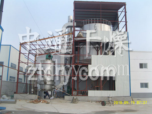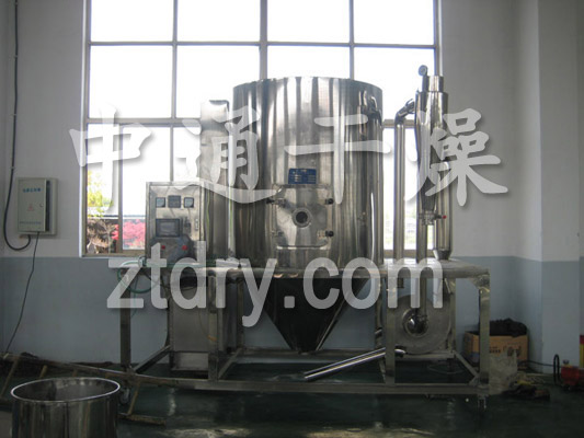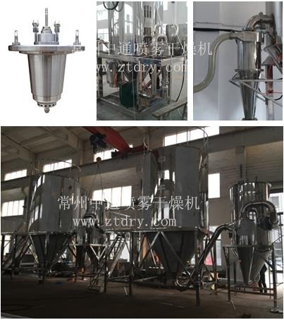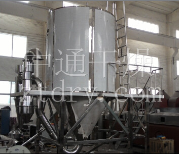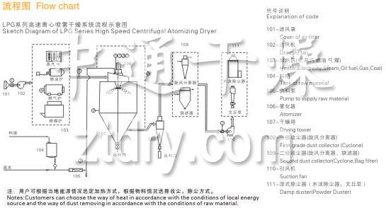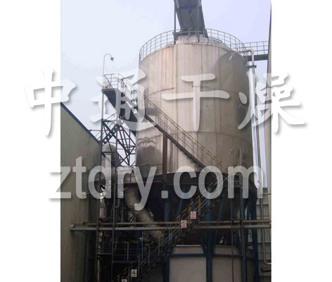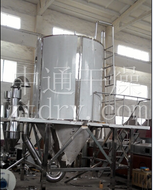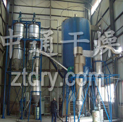 空气经过过滤和加热,进入干燥器顶部空气分配器,热空气呈螺旋状均匀地进入干燥室。料液经塔体顶部的高速离心雾化器,(旋转)喷雾成极细微的雾状液珠,与热空气并流接触,在极短的时间内可干燥为成品。成品连续地由干燥塔底部和旋风分离器中输出,废气由风机排空。