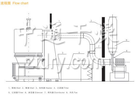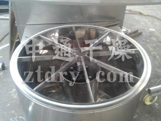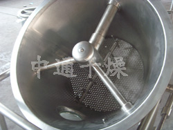 空气经加热净化后,由引风机从下部导入,穿过料斗的孔洞板。在工作室内,经搅拌和负压作用形成流态化,水份快速蒸发后随着排气带走,物料快速干燥。