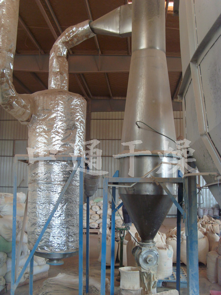 3、干品收集旋风分离器锥体部位设置压缩空气喷吹,防止物料上下翻滚无法正常出料。
