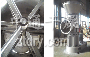 底部强化器设计独特,搅拌齿为菱形,其流线性能使风阻达到最小,设置在圆锥形料斗内,分动刀和定刀,粉碎效果显著,使下落的结块物料迅速粉碎为适合气流干燥的粉粒料,搅拌的另一个主要作用是分散物料,加大了与料斗下面进来的高速热风的接触面积,于是料斗区形成了一个强烈传热传质的流化床,大部分湿分在料斗区被干燥。随着干燥的进行,变轻变细的干料受气流作用明显,与气流一起上升并进一步干燥,最后从干燥塔顶部出来进入物料收集系统。