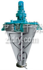 由摆线针轮减速机连接中心螺杆及外层螺带以相同转速转动。工作时,中心螺杆将混合物料由底部提升到顶部,同时线速度较大的外部螺带将物料由下而上沿锥形筒壁盘提升,二种运动在离心力作用下又将物料沿切线方向抛向空间,物料产生强烈的对流剪切、扩散,从而达到快速混合的目的。(螺杆也可做成反向螺杆)。