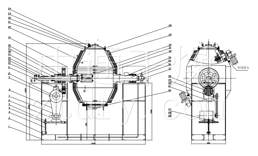 带有搅拌的一端朝下,搅拌叶形式可根据各种物料选型。在设备的上部进料口通入物料,靠搅拌叶的不断翻动,使物料反应、浓缩。