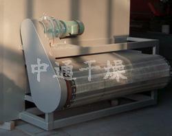 物料由加料器均匀地铺在网带上,网带一般采用12-60目不锈钢丝网,由传动装置拖动在干燥机内移动。干燥机由若干单元组成,每一单元热风独立循环,部分尾气由专门排湿风机排出,废气由调节阀控制,热气由下往上或由上往下穿过铺满物料的网带完成热量与质量传递的进程,带走物料水份。网带缓慢移动,运行速度可根据物料温度自由调节,干燥后的成品连续落入收料器中。上下循环单元根据用户需要可灵活配备,单元数量亦可根据需要选取。