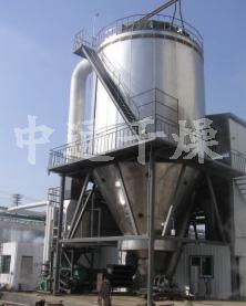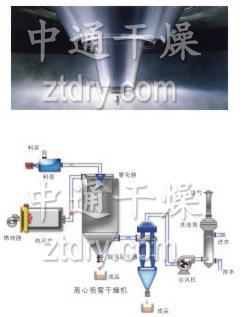 空气经过过滤和加热,进入干燥器顶部空气分配器,热空气呈螺旋状均匀地进入干燥室。料液经塔体顶部的高速离心雾化器,(旋转)喷雾成极细微的雾状液珠,与热空气并流接触,在极短的时间内可干燥为成品。成品连续地由干燥塔底部和旋风分离器中输出,废气由风机排空。