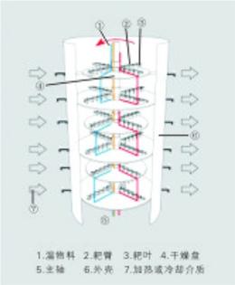 湿物料自加料器连续地加到干燥器上部第一层干燥盘上,带有耙叶的耙臂作回转运动,使耙臂连续地翻抄物料。物料沿指数螺旋线流过干燥盘表面,在小干燥盘上的物料被移送到外缘,在大干盘上的物料向里移动并从中间落料口落入下一层小干燥盘中。大小干燥盘上下交替排列,物料得以连续地流过整个干燥器。中空的干燥盘内通入加热介质,加热介质形式有饱和蒸汽、热水和导热油,加热介质由干燥盘的一端进入,从另一端导出。已干物料从最后一层干燥盘落到壳体的底层,最后被耙叶移送到出料口排出。湿汽从物料逸出,由设在顶盖上的排湿口排出,真空型盘式干燥器的湿汽由设在顶盖上的真空泵口抽出。从底层排出的干物料可直接包装。通过配加翅片加热器、溶剂回收冷凝器、袋式除尘器、干料返混机构、引风机等辅机,可提高其干燥的生产能力,干燥膏糊状和热敏性物料,可方便地回收溶剂,并能进行热解和反应操作。