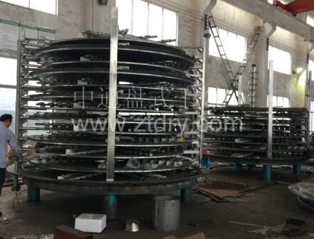 目前我公司生产车间有多台大型盘式干燥机正在制作,下图为两台PLG3000/12大型盘式干燥机装配现场照片:
