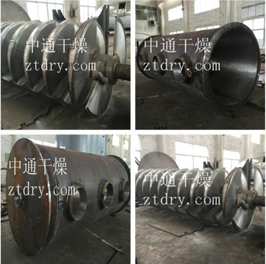 目前我公司生产车间正在制作的JPG-8000大型桨叶耙式干燥机传热面积达50平方,采用填料加机封的双密封形式,可保证真空度达-0.09以上。下图为部分再起制作照片: