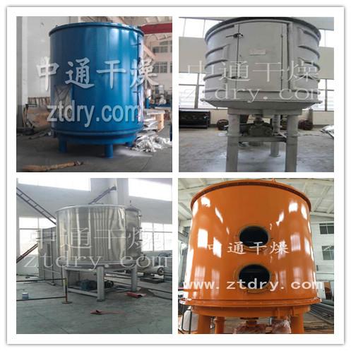 湿物料自加料器连续地加到干燥器上部第一层干燥盘上,带有耙叶的耙臂作回转运动使耙臂作回转运动使耙叶连续地翻抄物料。物料沿指数螺旋线流过干燥盘表面,在小干燥盘上的物料被移送到外缘,并在外缘落到下方的大干燥盘外缘,在大干盘上物料向里移动并从中间落料口落如下一层小干燥盘中。大小干燥盘上下交替排列,物料得以连续地流过整个干燥器。中空的干燥盘内通入加热介质,加热介质形式有饱和蒸汽、热水和导热油,加热介质由干燥盘的一端进入,从另一端导出。已干物料从最后一层干燥盘落到壳体的底层,最后被耙叶移送到出料口排出。湿份从物料中逸出,由设在顶盖上的排湿口排出,真空型盘式干燥器的湿气由设在顶盖上的真空泵口排出。从底层排出的干物料可直接包装。通过配加翅片加热器、溶剂回收冷凝器、袋式除尘器、干料返混机构、引风机等辅机,可提高其干燥的生产能力,干燥膏糊状和热敏性物 料,可方便地回收溶剂,并能进行热解和反应操作。